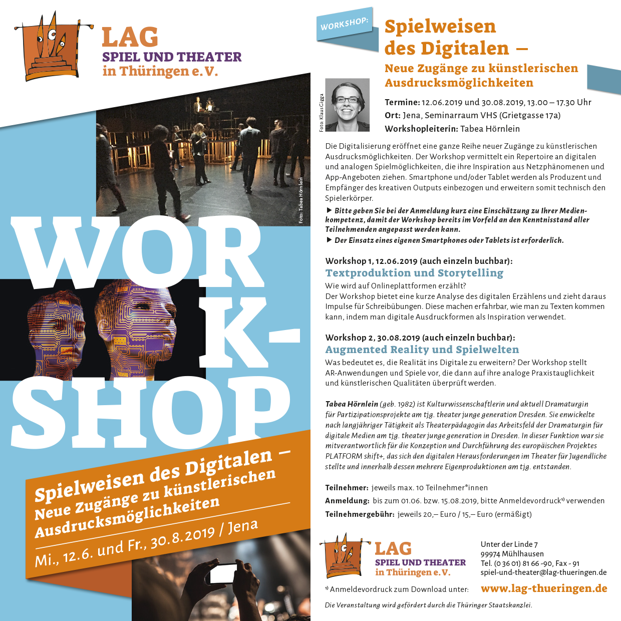 Die Digitalisierung eröffnet eine ganze Reihe neuer Zugänge zu künstlerischen Ausdrucksmöglichkeiten. Die Fortbildung für Theaterpädagog*innen, Lehrer*innen und Interessierte vermittelt ein Repertoire an digitalen und analogen Spielmöglichkeiten, die ihre Inspiration aus Netzphänomenen und App-Angeboten ziehen. Smartphone und/oder Tablet werden als Produzent und Empfänger des kreativen Outputs einbezogen und erweitern somit technisch den Spielerkörper. Die Themen der einzelnen Termine sind: Textproduktion und Storytelling bzw. Augmented Reality und Spielwelten.